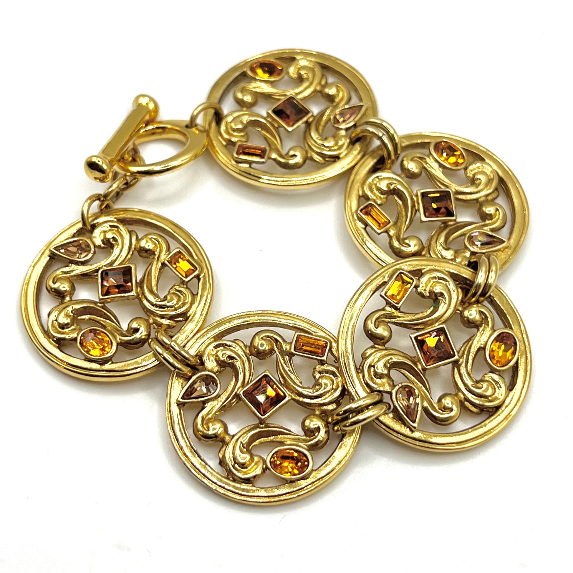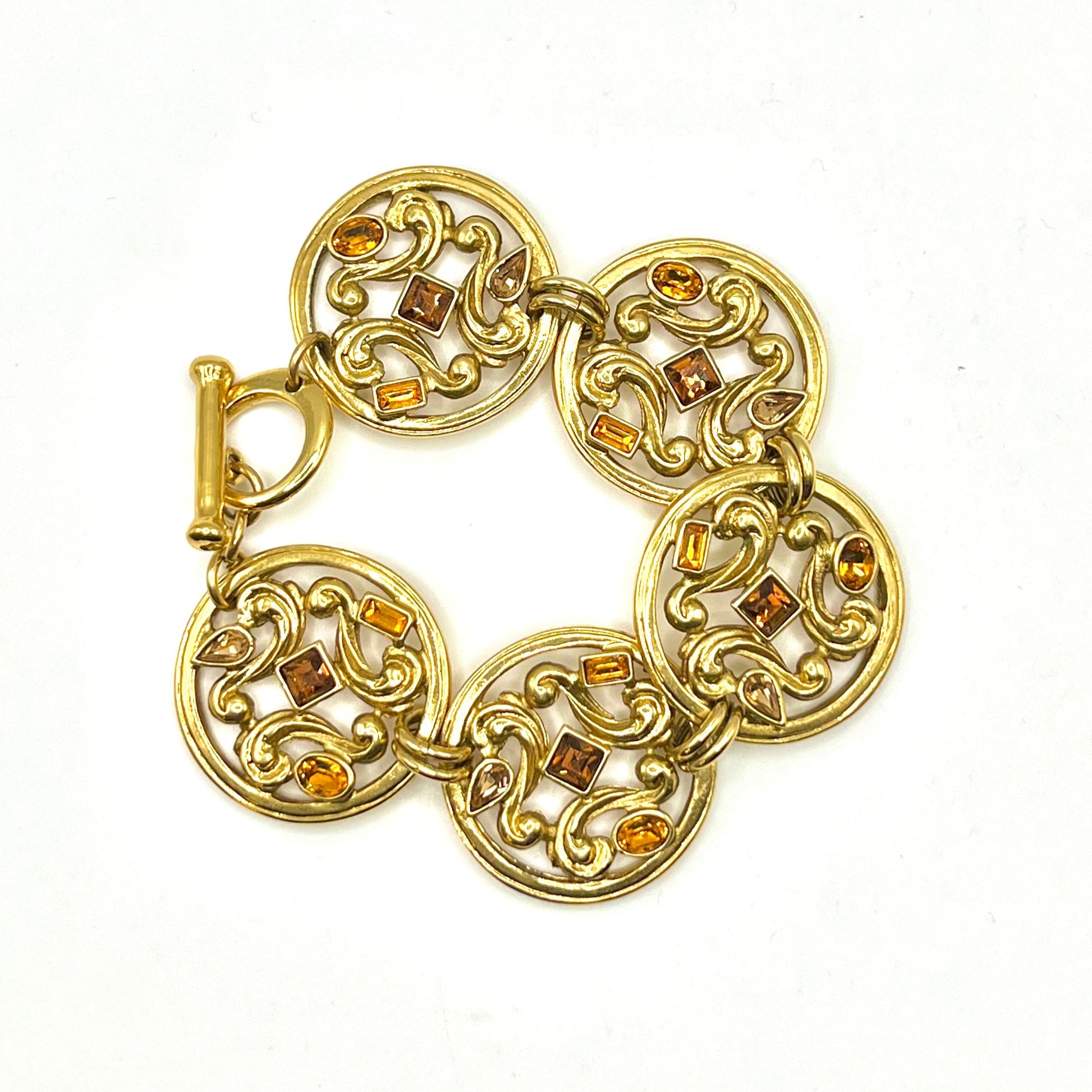 MAGNIFIQUE bracelet Yves Saint Laurent formé d'une suite de médaillons ajourés et ciselés, sertis de beaux strass taillés de couleur jaune orangé.